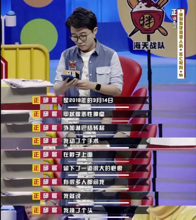 今年3月14日,邱晨确诊甲状腺恶性肿瘤。在接受治疗后,她的脖子上留下了一道很长的疤,别人问她怎么回事,她轻松地说,“换了个头”。