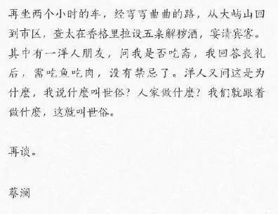洋人朋友问蔡澜是否吃斋,蔡澜说丧礼后需持续吃肉,没有禁忌了。洋人问为什么,蔡澜说,什么叫世俗,人家做什么,我们就做什么,这就叫世俗。