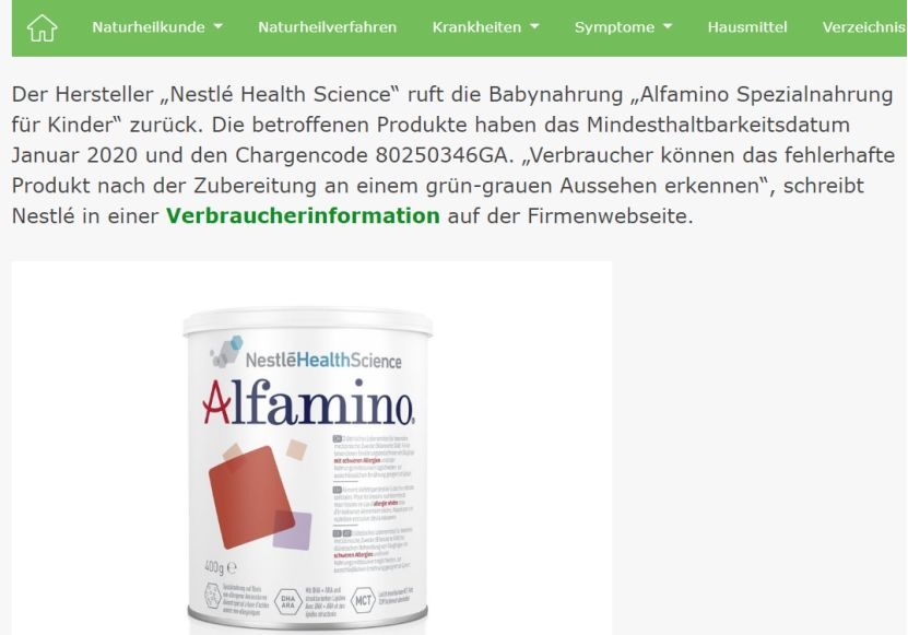 12月6日,雀巢公司德国官网发文称,雀巢日前宣布在德国召回一批恩敏舒氨基酸婴儿配方奶粉,原因是其部分产品的矿物质含量过高,可能引起儿童不适,如有影响必须立刻就医。德国媒体随后普遍报道了这一事件,提醒家长注意安全。