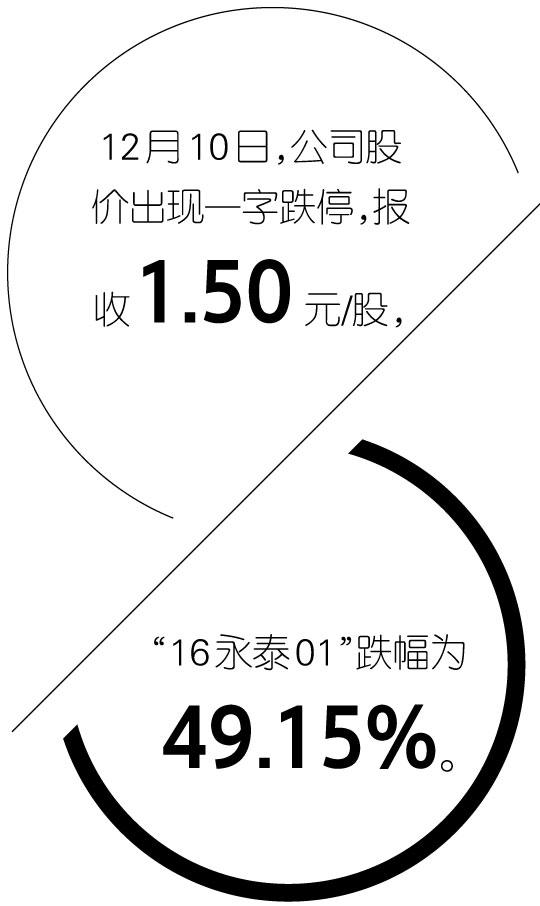12月10日,公司股价出现一字跌停,报收1.50元/股;“16永泰01”、“16永泰02”和“16永泰03”等3只债券也出现大跌,跌幅分别为49.15%、35.08%和10.36%。