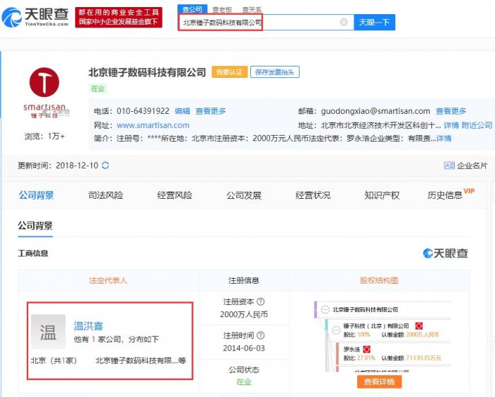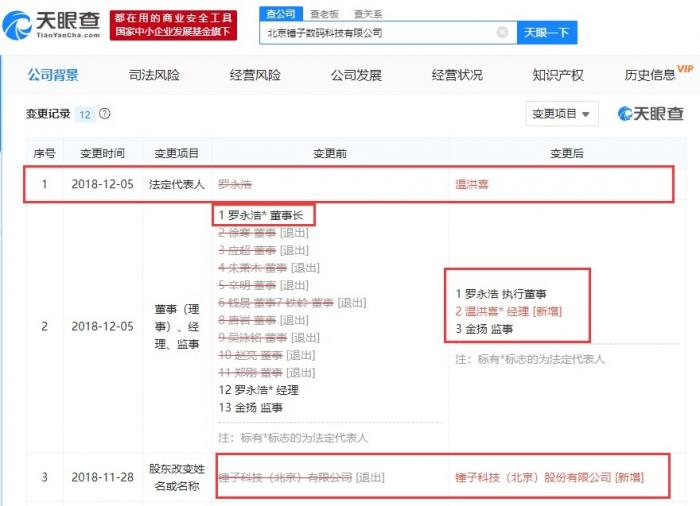 据天眼查数据显示,2018年12月5日,“锤子科技(北京)股份有限公司”全资子公司“北京锤子数码科技有限公司”法定代表人发生变更,由罗永浩变更为温洪喜,温洪喜同时担任经理一职,罗永浩由董事长变更为执行董事,其他10位董事全部退出。