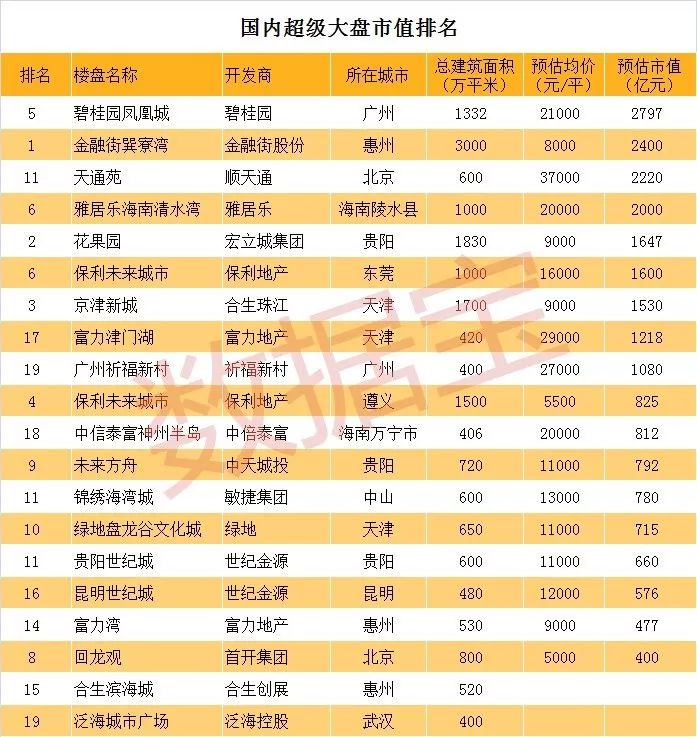 超大的体量加上较高的均价,必然产生市值巨大的楼盘。数据宝粗略统计显示,榜单中有9个楼盘的市值超过千亿元。其中,建筑面积达1332万平的广州碧桂园凤凰城,按照21000元每平的均价粗略计算,其市值近2800亿元,位居首位。需要说明的是,这种超级楼盘往往有多种产品,包括别墅、公寓、住宅、商业等,此处的市值以住宅均价粗略计算。 惠州的金融街巽寮湾,以8000元每平粗略计算其总市值达2400亿元;北京的天通苑,建面600万平,以37000元每平粗略计算其总市值达2220亿元。海南陵水县的雅居乐海南清水湾,总建面达1000万平,以20000元每平粗略计算其总市值达2000亿元。此外,花果园、保利未来城市、京津新城、富力津门湖、广州祈福新村等楼盘市值或均超过千亿元。