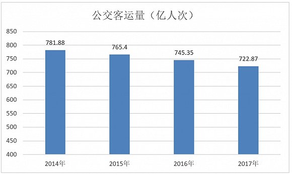 从2014年开始,全国城市公共汽电车的客运量开始逐年下降,从2014年的781.88亿人次下降到2017年的722.87亿人次,整体的运营里程也从2014年的1315.66亿公里下降到2017年的1272.15亿公里。