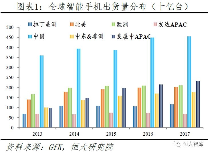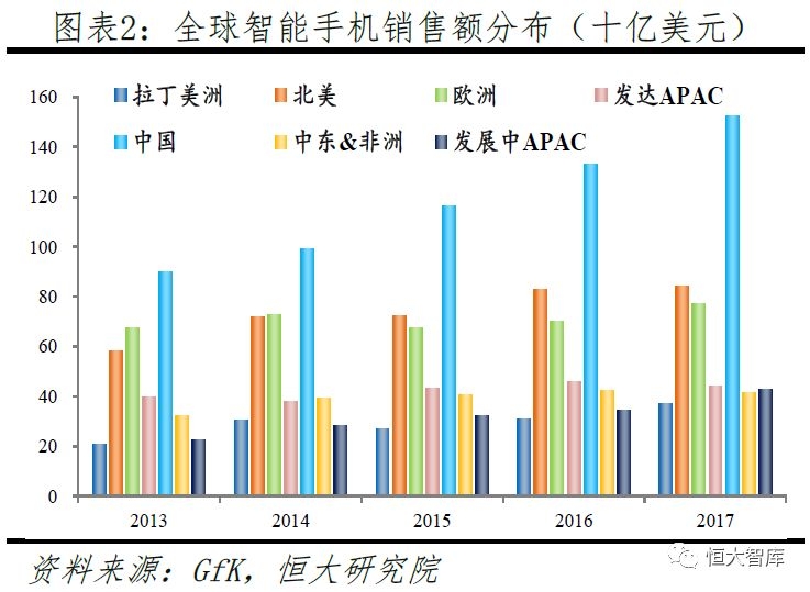 据统计,2017年全球智能手机出货量为15.59亿台、销售额约5000亿美元,中国市场销量份额约占30%、为全球第一。