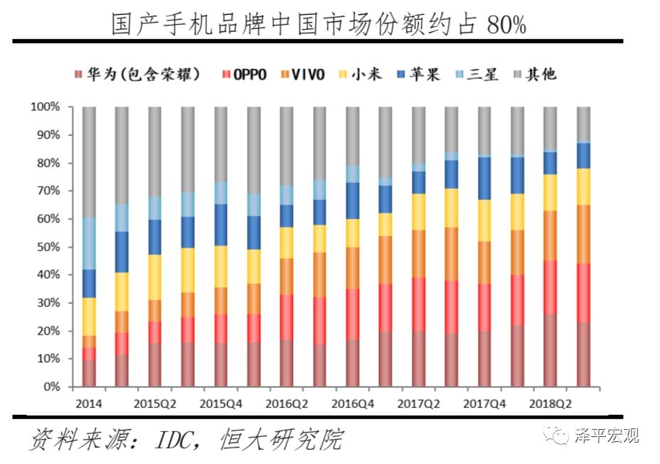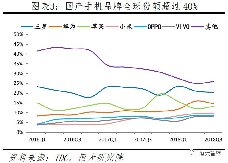 从全球市场来看,2018Q3市场份额前六位厂商分别为三星(20.3%)、华为(14.6%)、苹果(13.2%)、小米(9.7%)、OPPO(8.4%)、Vivo(7.9%),华米OV市占率合计超过40%,三星和苹果的市占率则从13、14年的高峰逐渐下滑,今年二季度华为全球市占率首次反超苹果。