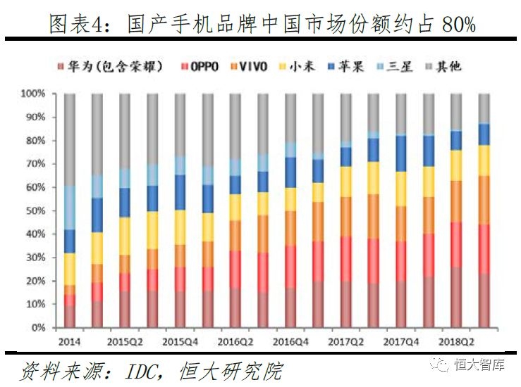 中国市场方面,2018Q3市场份额前五位厂商分别为华为(23%)、OPPO(21%)、Vivo(21%)、小米(13%)、苹果(9%),华米OV市占率合计接近80%。三星由于在中国市场的战略出现失误,目前市占率仅1%,华为则连续7个季度保持市占率第一。