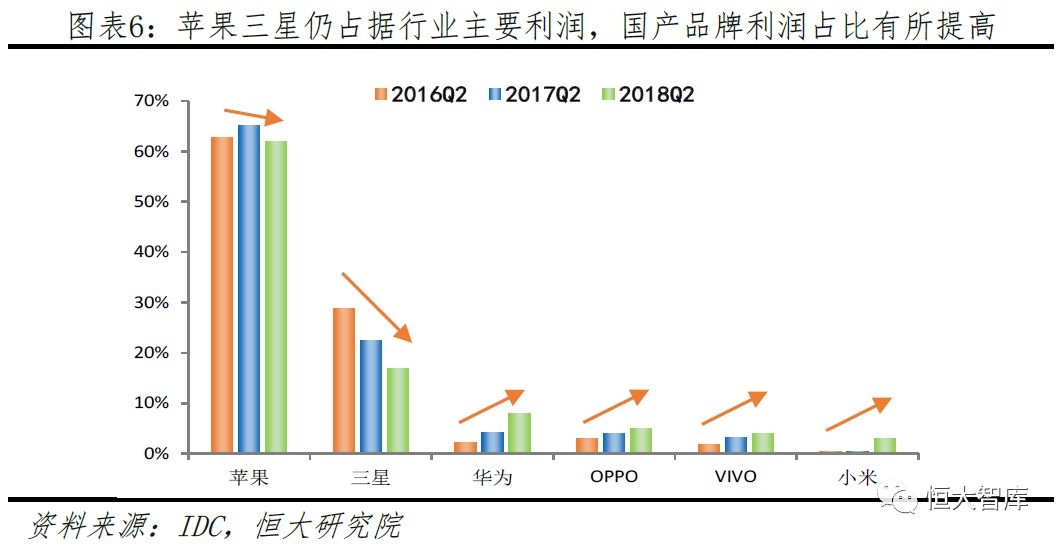 此前华为、小米、OPPO等品牌的利润占比均在2-3%左右。但由于近两年智能手机行业创新减缓、耐用程度提高拉长换机周期,今年三星、苹果等手机出货量均不及预期。国产品牌则借此机会依靠旗舰款升级来抢占竞争对手流失份额,利润占比也攀升至3-8%不等,盈利能力有所提高。