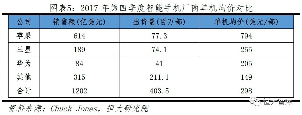 以2017年第四季度为例,苹果出货量仅占行业整体的20%,但销售收入和利润占比分别高达50%和87%。从单机销售均价(PUR, per unit revenue)来看,苹果、三星、华为和其他品牌PUR分别为794、255、205、149美元/部。凭借强大的品牌溢价,苹果牢牢占据高端市场,即使在销售淡季苹果利润占比也高达60%,超过所有其他品牌之和。巨大的利润使得苹果在研发、创新与品牌方面的投入更具优势,从而形成良性循环、进一步巩固行业地位。