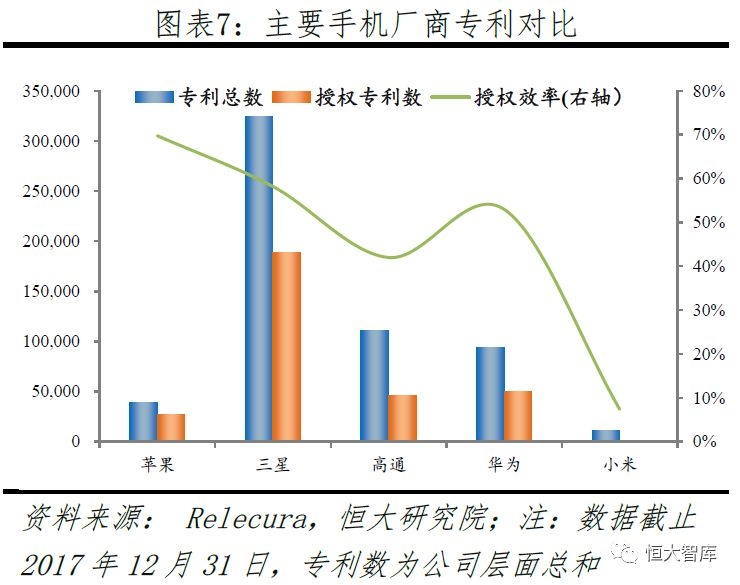 Relecura专利搜索结果显示,苹果、三星、华为和小米四大手机厂商中,三星(包括面板、芯片、镜头、半导体等所有部门)以32.4万专利总数和18.9万授权专利数位居第一,远超其他竞争对手;其次为华为、苹果、小米。
