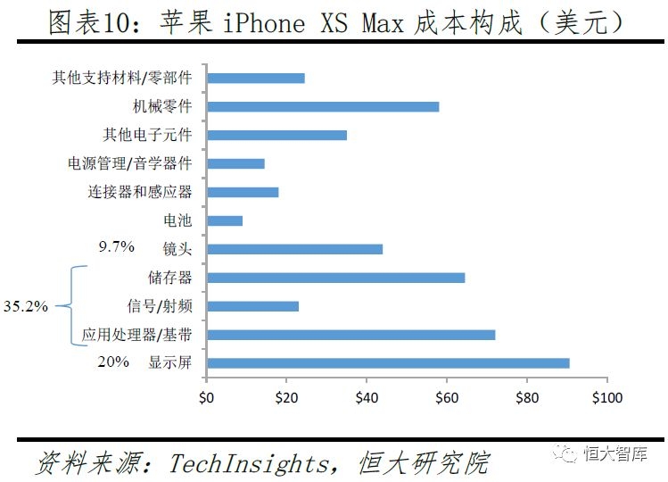 以苹果最新256GB iPhone XS Max为例,成本测算约为453美元,其中半导体芯片类成本为159.5美元,显示屏90.5美元,摄像头44美金,三类占总成本65%。