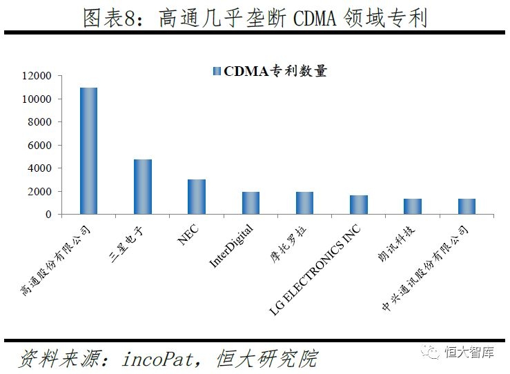 但从专利质量来看,中国厂商与苹果、高通和三星还有差距。专利授权率方面,苹果、三星、高通、华为、小米的专利授权比例(授权数/申请总数)分别为70%、58%、42%、53%、7%;专利影响力方面,Relecura根据被引用率等指标对专利质量进行评分,超过3分即为高质量专利,其中苹果、三星、华为、小米的高质量专利比例分别为51%、5%、3%、9%。在许多核心技术方面,中国仍需要依靠专利授权或直接使用对方产品。在3G/4G时代,高通就是通过掌握CDMA(码分多址数字式通信技术)核心专利并不断增加相关技术的申请量形成专利池,全球专利占比一度超九成,形成垄断。