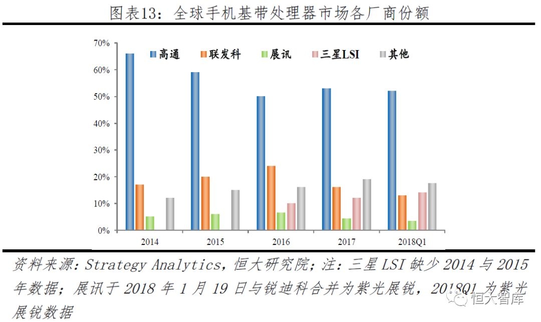 手机基带处理器同样是一个高度垄断的市场,全球主要玩家只有高通、联发科、三星LSI、海思、展讯和英特尔。2018年Q1,高通市场份额达到52%,其次为三星LSI(14%)、联发科(13%)、海思(10%)。其中联发科和紫光展锐(原展讯)均是侧重中低端市场。