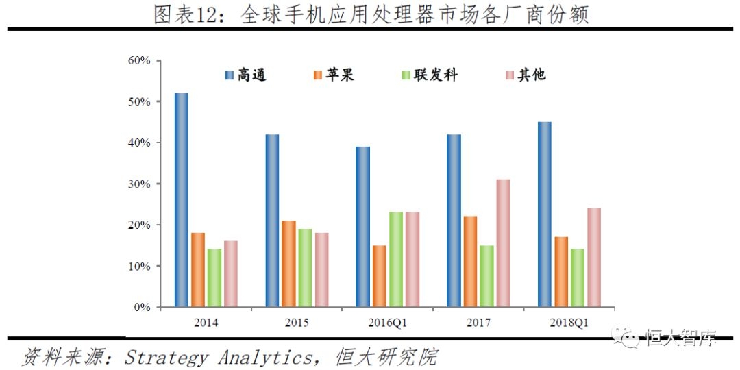 高通是全球手机应用处理器市场霸主。2018年Q1,高通在AP市场的占有率达到45%,其次为苹果(17%)、三星LSI(14%)、联发科(14%),华为海思市场份额预计在9%左右。其中苹果、三星、华为芯片均只配套自家品牌的手机,高通则是小米OV的主要芯片供应商,联发科主要侧重于中低端市场。