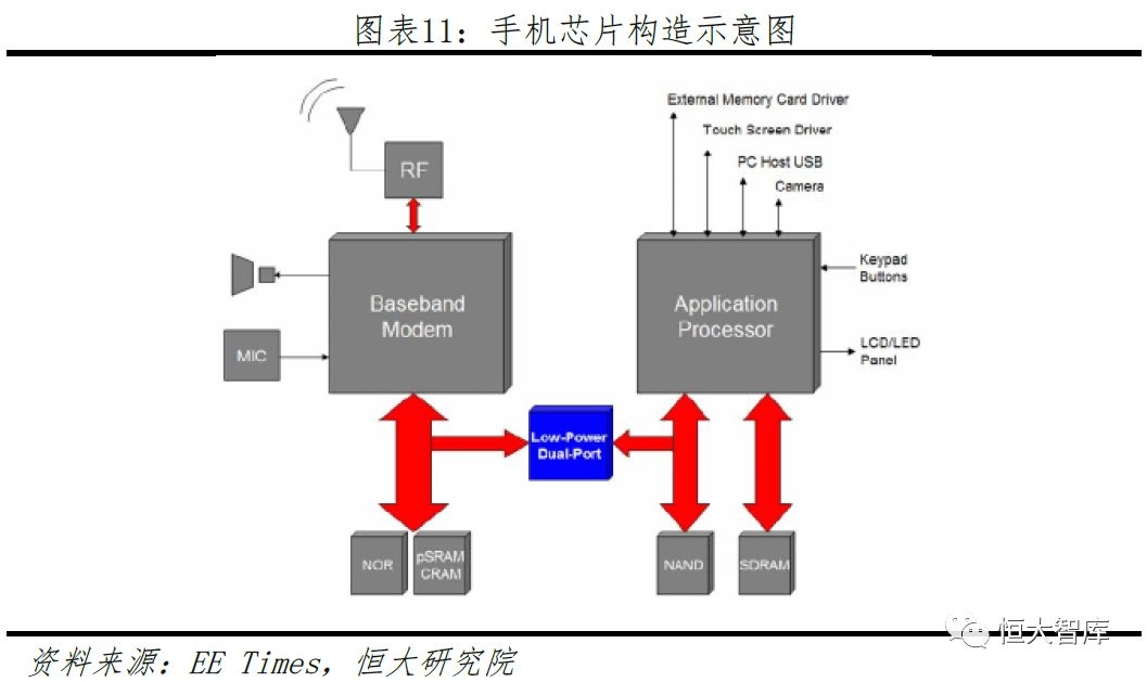 芯片是智能手机的成本和性能核心,对手机品牌定位也有着重要影响。不同于早前各类功能芯片分离,当前手机芯片集成了处理器、模拟和数字IP核、存储器在同一芯片上,因此也被称为SoC(System-on-Chip,系统级芯片)。苹果A系列、高通骁龙系列、三星猎户座系列和华为麒麟系列等都是著名的SoC芯片。(苹果A系列SoC不包括基带部分,基带外挂)