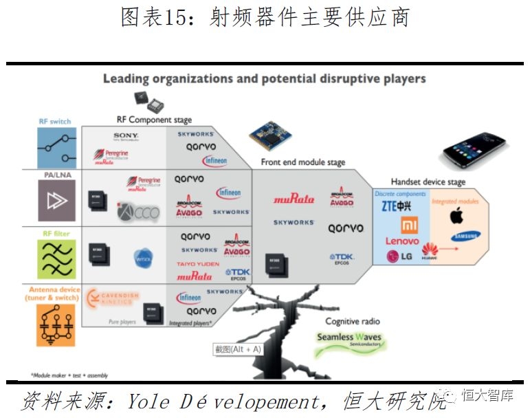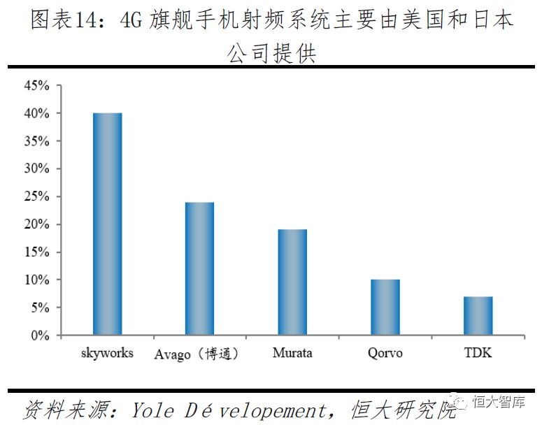 4G时代旗舰手机的射频系统市场份额基本Skyworks、Avago(博通)、Murata、Qorvo、TDK五家美国和日本公司把持,中国在这个领域基本还处于空白。