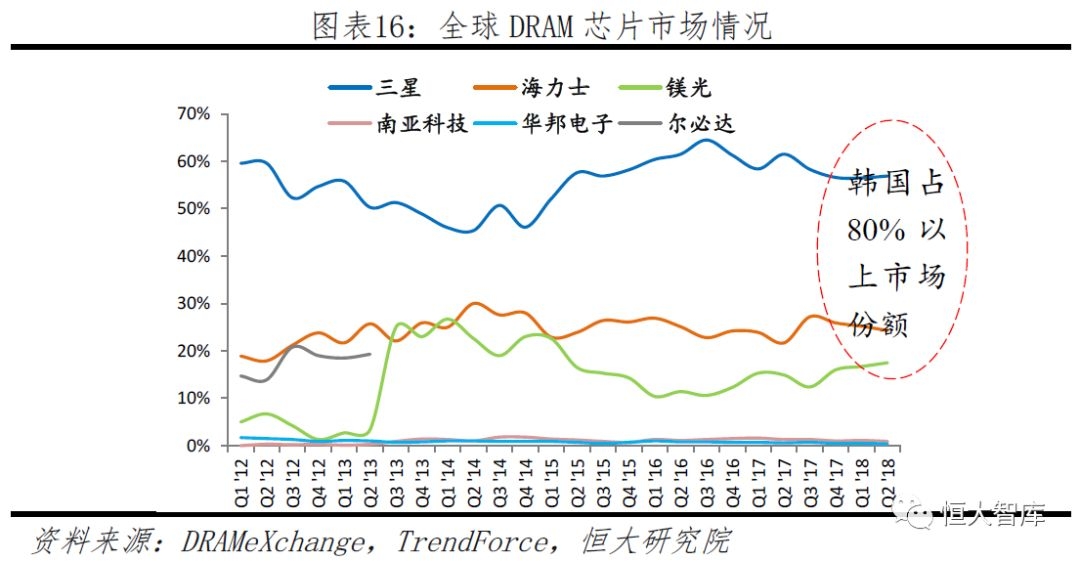 由于韩国在DRAM的绝对领导地位,除了美国镁光仍占超过10%的份额,其他竞争对手的市场份额基本在1%左右,无法形成威胁。华为海思虽然能够自研应用和基带处理器,但存储芯片仍需依赖外部供应商。