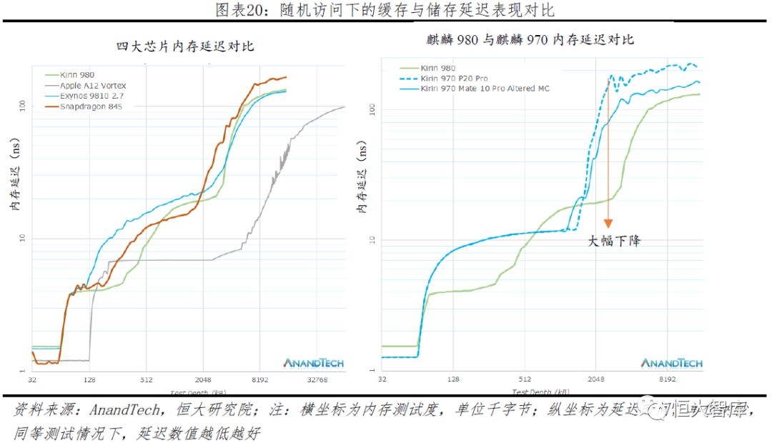 2)芯片性能上升。芯片根据操作系统可以分为安卓阵营与苹果iOS两大阵营。从综合性能来看,苹果A系列芯片远超同期对标的安卓阵营芯片。但在安卓阵营里,华为麒麟已经成为主力选手,某些性能甚至高于同期对标的高通骁龙系列与三星猎户座系列。以最新的苹果A12、华为麒麟980、高通骁龙845和三星猎户座9810对比,华为在内存、CPU、GPU均有出色表现。内存方面,得益于最新的Cortex A76架构,对比上一代麒麟980内存延时时间大幅度降低,并且在部分高负荷工作情况下延迟情况优于骁龙845。