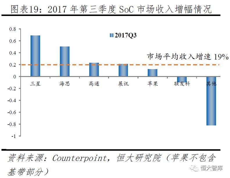 1)市场地位与收入上升。由于手机芯片研发对资金、技术与人才要求极高,除了6大品牌外的中小品牌生存环境十分艰难,市场占有率基本为0,市场收入也呈断崖式下跌。从近年的情况来看,仅三星、海思和高通保持收入增长,而三星和海思成长速度更快。其中,海思市场占比从2016年第三季度的6%上升至2017年第三季度的8%,期间收入增幅高达50%。