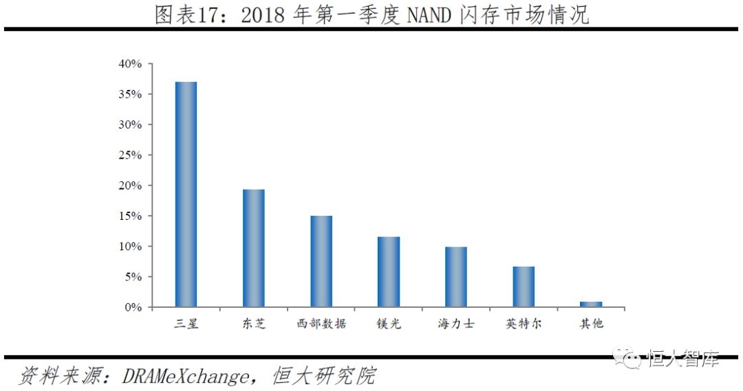 我们曾在《全球半导体产业转移启示录》分析过韩国半导体发展历史,韩国在发展半导体初期将DRAM作为切入点,利用技术引进、收购、自主研发和反周期投资等多种手段建立技术、规模和成本优势,连续多年市场份额超过80%,成为存储芯片第一强国。之后韩国将技术与市场优势扩大到NAND闪存市场,2018年第一季度NAND市场份额也超过50%。