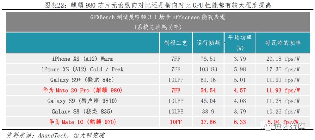 GPU性能方面一直是华为短板,此前问题在于性能低但能耗高。但此次麒麟980的GPU在图形、物理、offscreen等系列测试下,均有良好的峰值表现和持续性表现,性能显著提高。以曼哈顿3.1场景为例,对比麒麟970,平均功率从6.33瓦特降至4.57瓦特并且运行帧频提高45%,因此单位能耗有了100%的优化,非常接近骁龙845。