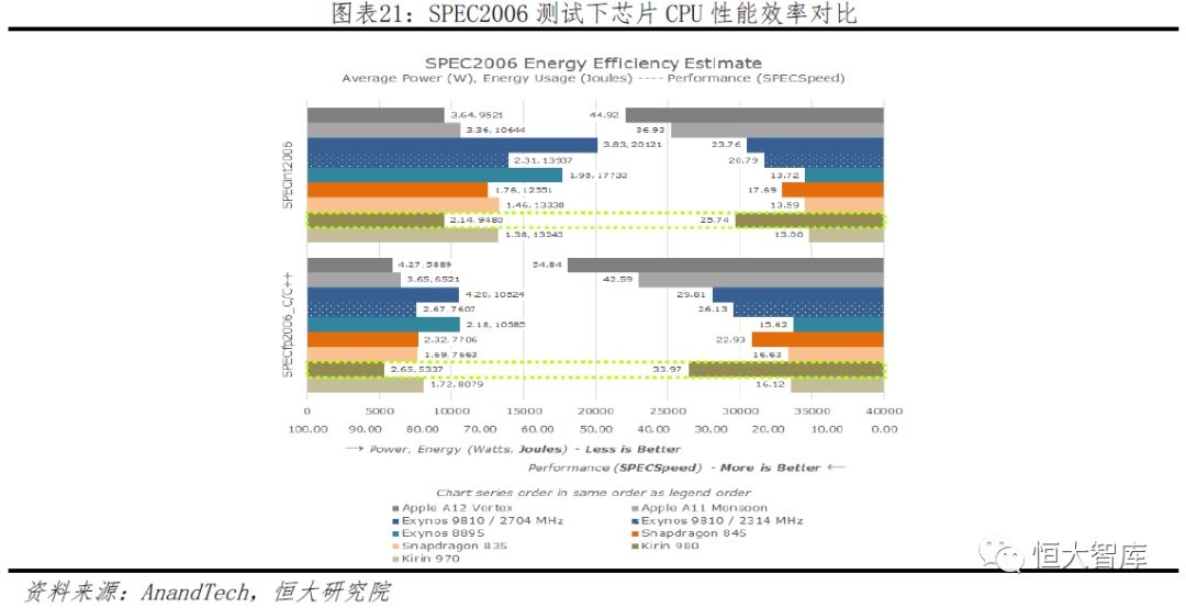 整体CPU性能方面,麒麟980实现性能翻倍的同时降低能耗55%,虽然绝对性能与苹果A12还有较大差距,但在SPECint2006与SPECfp环境里,性能超过安卓阵营的骁龙845和猎户座9810。