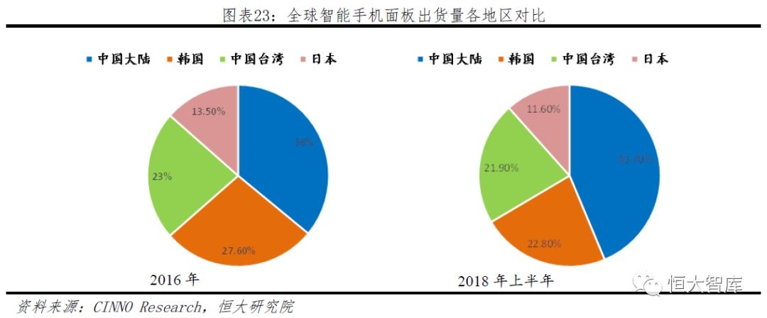 从地区出货量来看,中国大陆多年保持第一。与2016年对比,2018年上半年韩国、中国台湾和日本的份额占比均有不同程度下滑,其中韩国份额下滑约5个百分点,而同期中国大陆份额则增长近8个百分点。