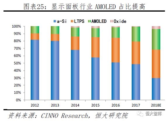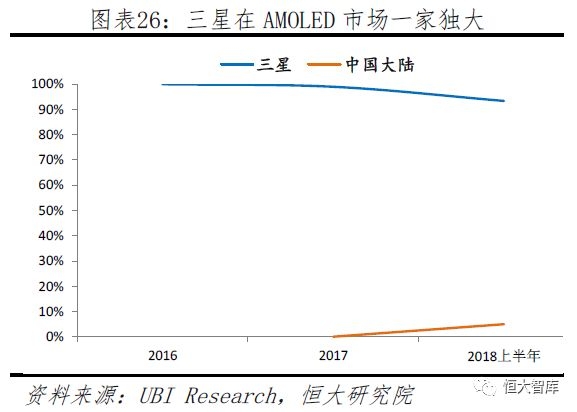 在AMOLED市场,三星目前维持垄断地位,国内厂商正在追赶。从技术分类来看,显示面板可以分为LCD(液晶显示)和AMOLED(有机电激光显示即柔性显示)两大类。LCD又包括α-Si(非晶硅)、LTPS(低温多晶硅)与Oxide(氧化物半导体)。对比传统的LCD技术,AMOLED屏幕具有广色域、高色彩度、轻薄、省电等特性,被称为下一代显示技术,因此自2012年开始由三星主导在高端机型中用AMOLED逐渐替代LCD。2018年上半年,α-Si出货占比降至42.9%,AMOLED份额不断提升至20.4%。