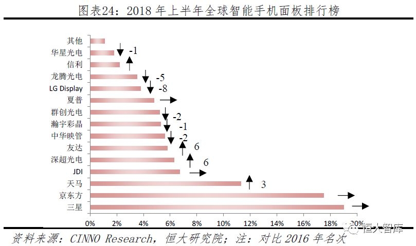 从参与公司来看,除了三星与京东方依旧保持排名前二,其余排名均有较大变化。此外,2018年上半年智能手机面板出货量排名前五中京东方、天马、深超光电均为大陆企业,合计份额达到35%。