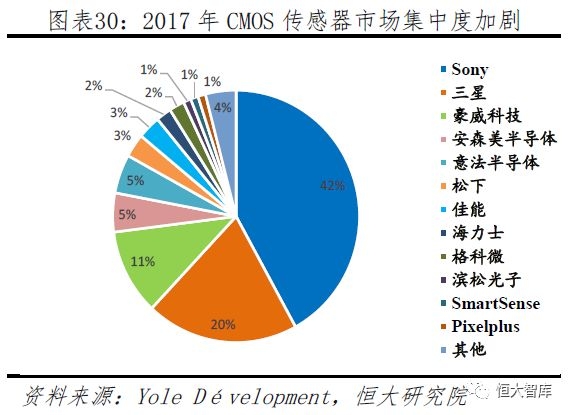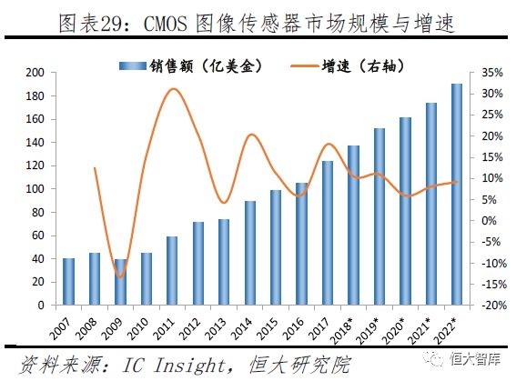 日韩企业垄断高端CMOS图像传感器(CIS,CMOS Image Sensor)市场,中国企业正在进军中高端市场。CMOS图像传感器是摄像头成本占比最高的部件,据IC Insight数据统计显示,2017年CMOS图像传感器销售额125亿美元,同比增长19%。