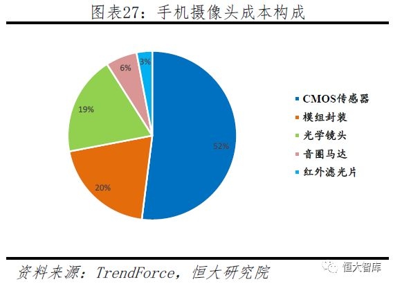 手机摄像头由CMOS图像传感器、光学镜头、音圈马达、红外滤光片、支架等组成。其中CMOS图像传感器成本占比最高,其次为光学镜头、模组整装、音圈马达与红外滤光片。