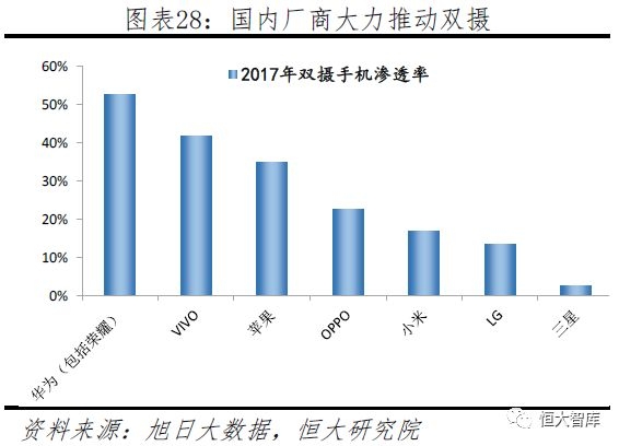 相比芯片的高技术门槛、高研发投入,摄像头技术相对来说突破快、对整机效益贡献明显。近年来摄像头领域创新包括双摄、3D拍照、人工智能摄像等,其中双摄渗透率超20%,成为当下整机的主要卖点之一。在双摄领域,国内厂商推动力度较大,三星相对进度较慢。