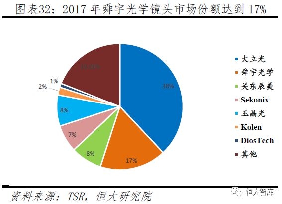 光学镜头一直是中国台湾的优势产业,中国台湾多年保持50%以上市场份额,其中大立光排名第一,2017年市场份额达到38%。