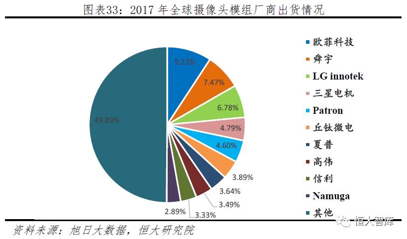 中国成为全球最大摄像头模组生产基地,市场份额占比超7成。相比于图像传感器和光学镜头,下游的模组技术门槛相对低,市场更加分散。2017年前5厂商市场占有率合计仅33%。