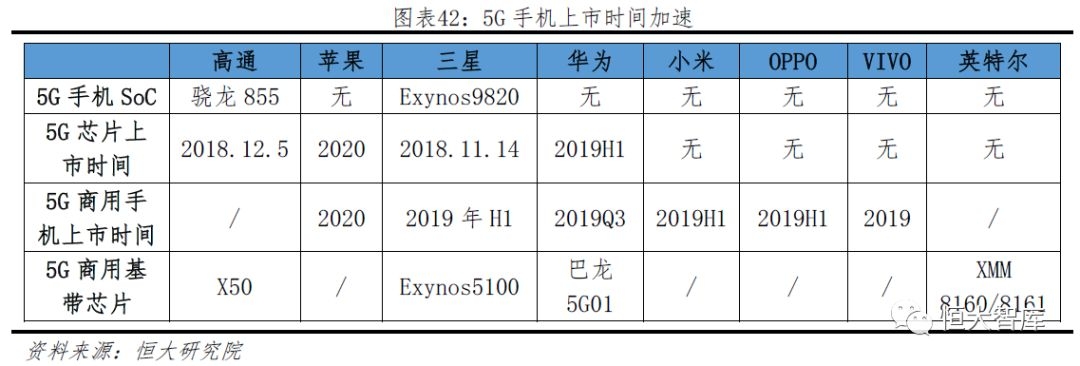 主流厂商正在加快5G商用进度。目前芯片厂商基本都推出了商用5G基带芯片,且高通和三星已经推出5G SoC芯片,5G手机也将2019年上半年上市;华为目前发布5G基带芯片巴龙,但尚未推出SoC芯片,5G手机可能要等到19年下半年推出;苹果因转用英特尔基带芯片导致研发进度减缓,可能等到2020年才推出5G手机,在主流厂商中进度最慢。