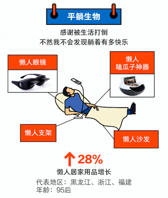 95后人群中有更多的“平躺生物”,他们更多在居家用品上尝试“懒人神器”。来自淘宝的统计数据显示,淘宝懒人居家用品消费较去年增长了28%,消费者以95后为主,主要分布在黑龙江、浙江和福建。