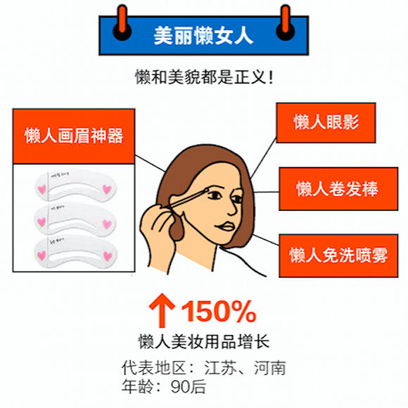 此外,淘宝数据还显示,在各类懒人消费中,懒人美妆用品和懒人运动产品的消费颇高。繁忙工作和快节奏生活下,爱美的女性消费者也开始尝试一些“懒人美妆神器”,画眉神器、懒人卷发棒、懒人眼影、懒人面膜等美妆用品的增幅达到150%,这类消费在江苏、河南最为突出。而运动产品方面,懒人甩脂机、懒人收腹机、办公室椭圆机等懒人运动器械较去年有51%的增幅,其中山东人消费最多懒人运动产品。