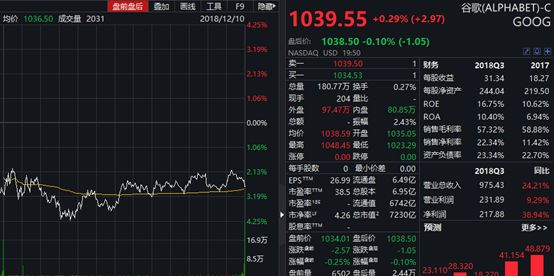 10日,谷歌股价早盘小幅下跌,随后跟随美国大型科技股上涨的步伐逐步攀升,收盘价1039.55美元/股,小幅上涨0.29%。