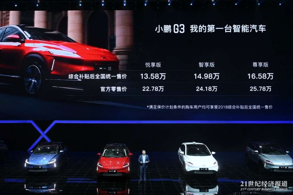 (21世纪经济报道摄影记者 陈逸航))小鹏汽车12月12日晚上在广州发布其首款上市车型——小鹏G3。该车定位于互联网基因纯电SUV。