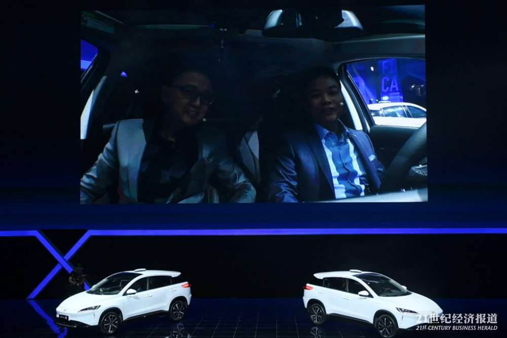 小鹏汽车成立于2014年,初创投资者主要为UC优视联合创始人及前阿里巴巴移动事业群总裁何小鹏,联合创始人为前广汽新能源控制系统开发负责人夏珩以及前广汽智能汽车和无人驾驶负责人何涛。图为两人在车内聊天的视频画面。