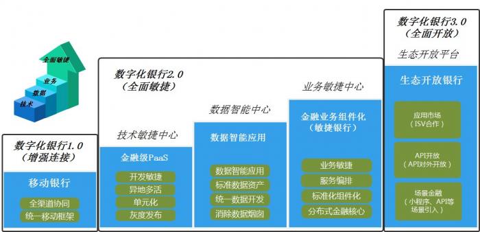 在用户都被数字化习惯养成的时代下,跨越“数字鸿沟”是所有银行都要面对和经历的过程。很多银行已经开启了数字化转型进程,来提升客户体验、提升业务敏捷能力、提升开放合作能力: