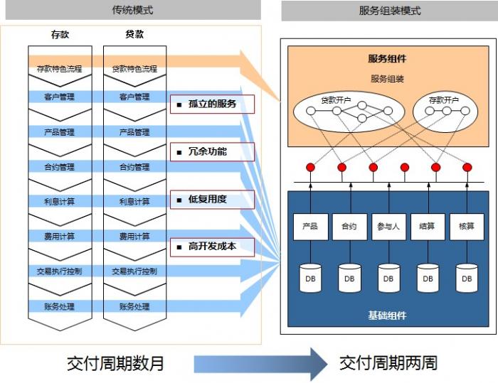 毕马威发布了《助力企业数字化转型》的报告,其中的一些观点颇为值得关注。报告提到,未来企业将重点致力于解决从传统信息化到数字化的转变,包含从“烟囱系统,重复开发”到“共享沉淀服务化能力”;从“数据孤岛”到“数据智能决策”等核心IT能力的转变。可见,金融机构能否建立一个能力打通、组件化、服务化的“共享化敏捷中心”,将成为其数字化转型的分水岭。今天,“共享化、组件化、中心化”的思想已经成为了主流数字化转型思想。