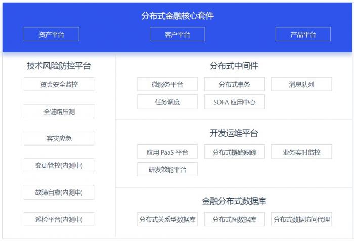 金融核心套件就是《金融业务敏捷中心》的重要组成部分,依托蚂蚁金服的金融领域建模和应用架构经验,形成一个高度聚合的Core Banking核心能力引擎,提供标准化、可重用的金融核心领域服务能力。