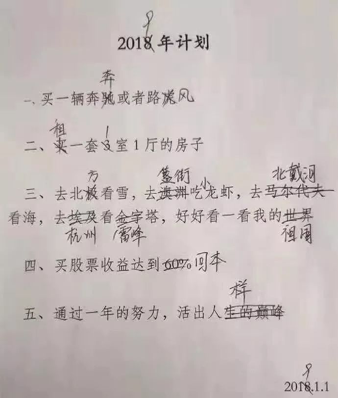 有网友晒出的2019年新计划,计划是在2018年的基础上改的,回头看看2018年年初定下的那些宏伟目标,不仅还没有实现,到了2019年,居然还要调低几档……