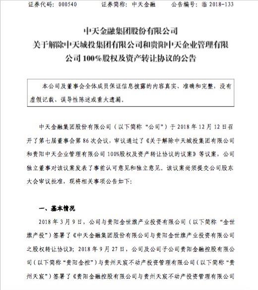 12月12日晚间,中天金融(000540.SZ)公布《关于解除中天城投集团有限公司和贵阳中天企业管理有限公司100%股权及资产转让协议的公告》。公告显示,“为提升上市公司的持续经营能力,保护公司及全体股东利益尤其是中小股东的利益,公司按照第二大股东贵阳市城市发展投资(集团)股份有限公司提议,根据贵阳市人民政府的要求,经审慎研究后与交易对方协商一致,拟解除与金世旗产投、贵州天宸签订的股权转让协议和资产转让协议,收回相关股权及资产。”