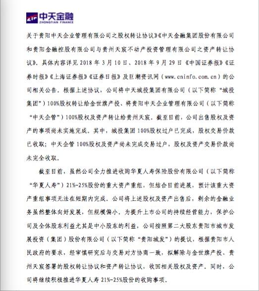 与此同时,中天金融将继续积极推进华夏人寿 21%-25%股份的收购事项。
