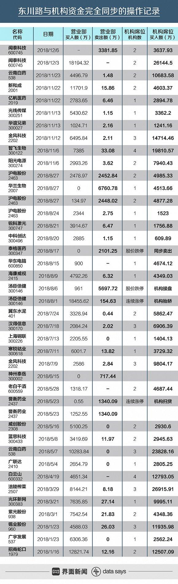 界面新闻记者初步统计,截至目前,申万宏源东川路营业部累计上榜64次,其中41次交易完全与机构席位同步买卖操作,主要涉及涨停机构抬轿或跌停机构接盘等现象,累计买入金额高达189298.92万元,累计卖出金额26603.75万元。