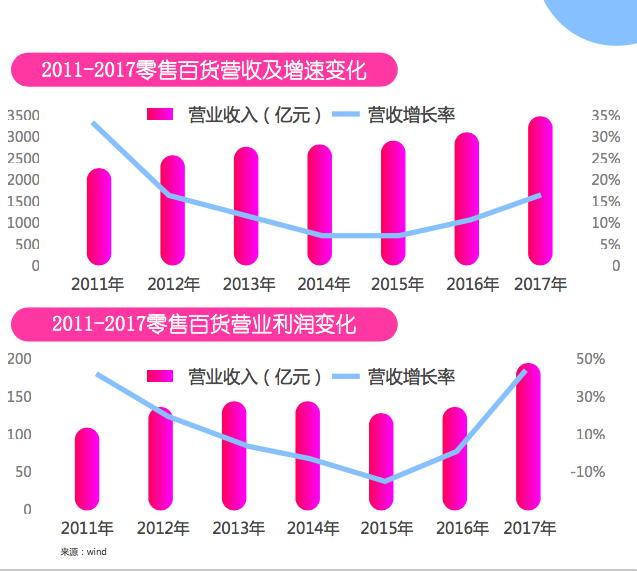 从商业百货行业近年来的发展趋势来看,新零售所带来的效应也正在积聚。报告显示,伴随新零售在消费支出中的持续提升,国内商业百货行业呈现出强烈的拐点:2012年前,国内商业百货业无论收入或利润增长都呈现迅猛态势,2013年销售开始疲软,甚至2014、2015年营业利润出现了增长停滞和负增长。