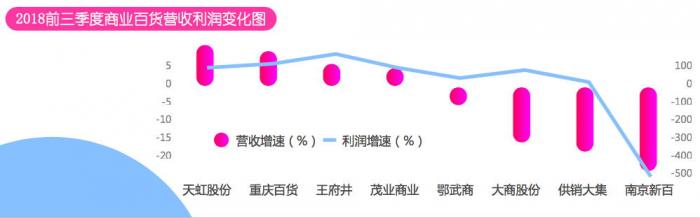 2017年,新零售开始萌芽,伴随线上线下融合加速,国内商业百货业的营收与利润也有所起色。从2018年前三季度业绩情况而言,拥抱新零售的商业百货体,无论是从营收还是净利润增速上,表现均远远优于传统商业百货体。以当前市值排名居前的8家企业为例,天虹股份、王府井、重庆百货从数字化、体验式、供应链等方面打造核心竞争力,呈现营收及利润双增长态势。