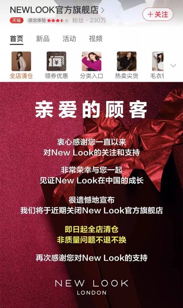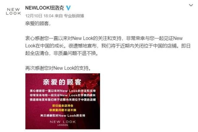 12月10日晚间,英国快时尚品牌New Look在官方微博宣布将于近期内关闭位于中国的店铺,即日起全店清仓,非质量问题不退不换。