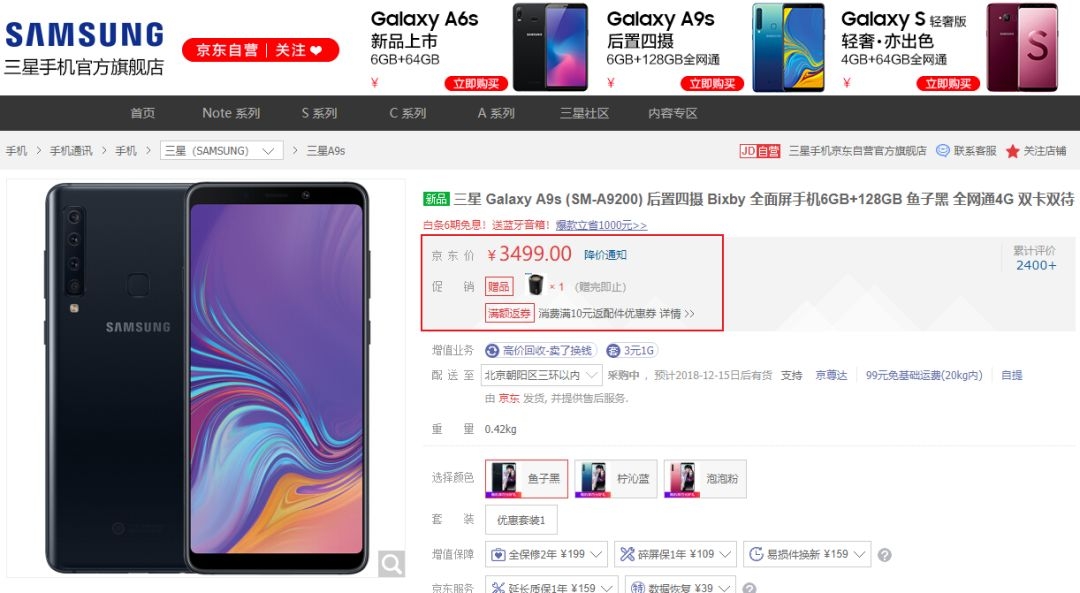 每日经济新闻记者注意到,这款Galaxy A8s手机在京东三星官方旗舰店上的预售价格为3499元,也是目前国产智能手机竞争最激烈的价位。
